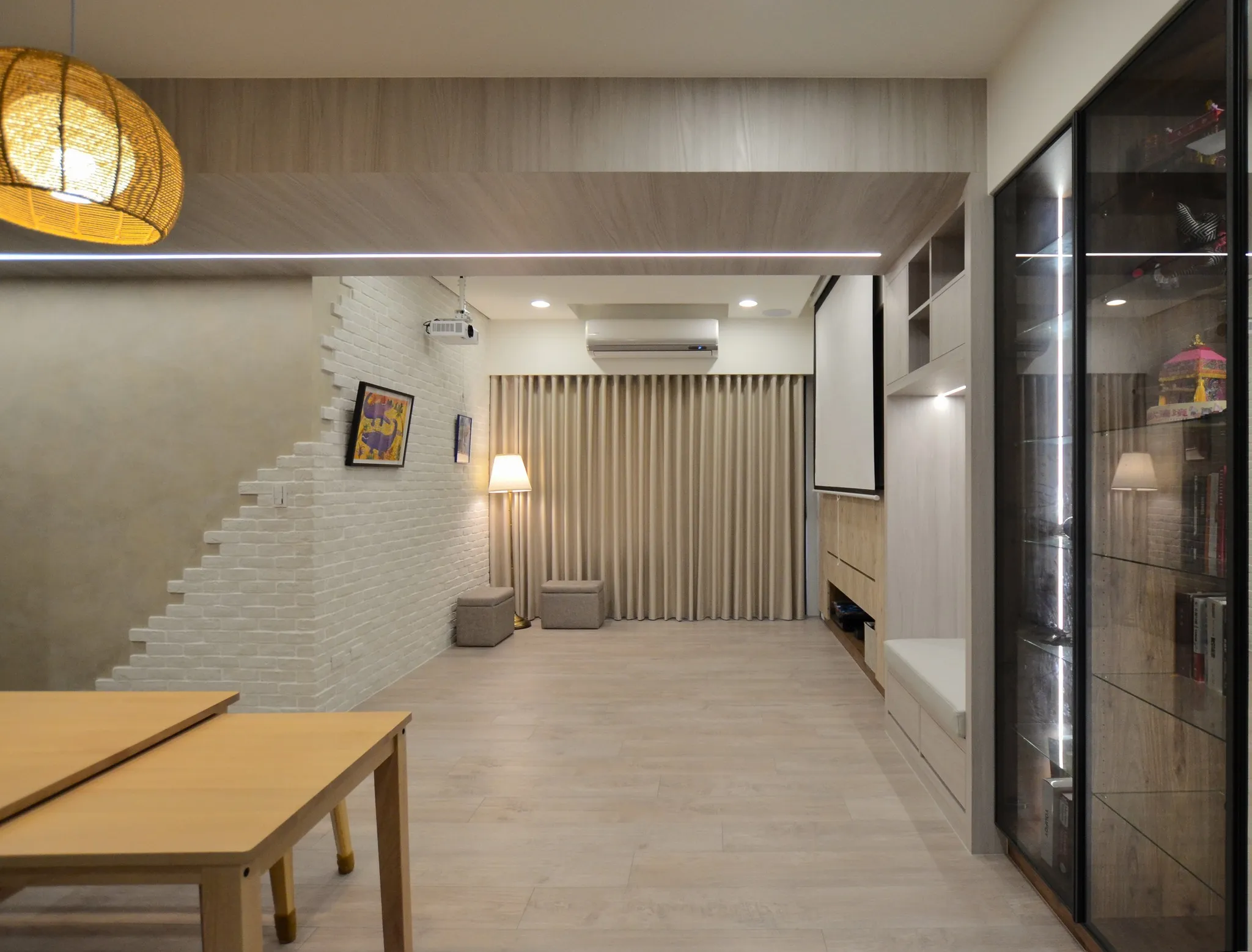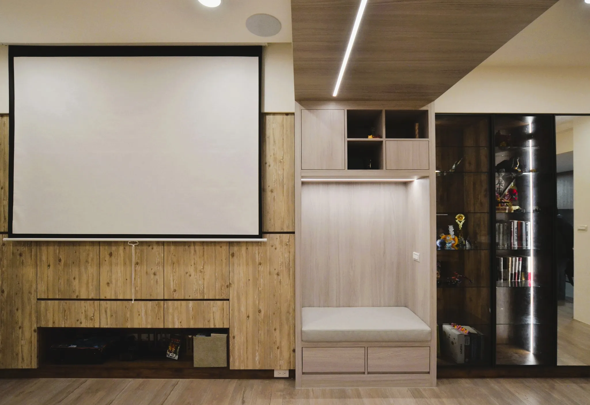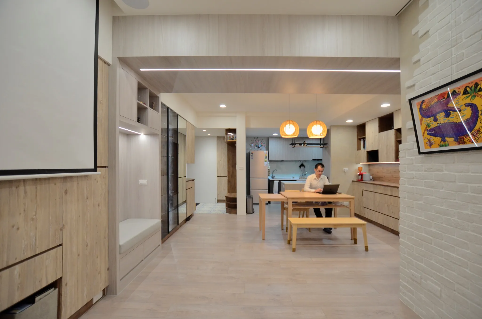 這是一個為四口之家量身打造的親子宅。 我們捨去傳統電視牆與沙發配置,改以投影機取代制式螢幕,讓客廳回歸最純粹的樣貌——一座能自由奔跑、玩耍、閱讀與成長的孩子活動空間。 無電視牆的設計,讓視覺更加留白,也讓空間使用更具彈性;白天是孩子的遊戲場,夜晚則化身為全家共享的投影劇院。整體以溫潤木質鋪陳,搭配柔和間接照明,營造安定、放鬆的居家氛圍,陪伴一家人的日常節奏。 收納機能整合於牆面之中,維持空間的清爽與秩序,讓生活自然發生。走廊牆面則選用斯曼特漆,細膩的手作質感在光影流動間展現層次,溫柔地串聯公共區域與私領域。 沒有沙發、沒有制式電視牆, 卻多了更多陪伴與互動。 這不只是一個完成的室內設計,而是一個以孩子為核心、為家庭成長預留彈性的生活場景。