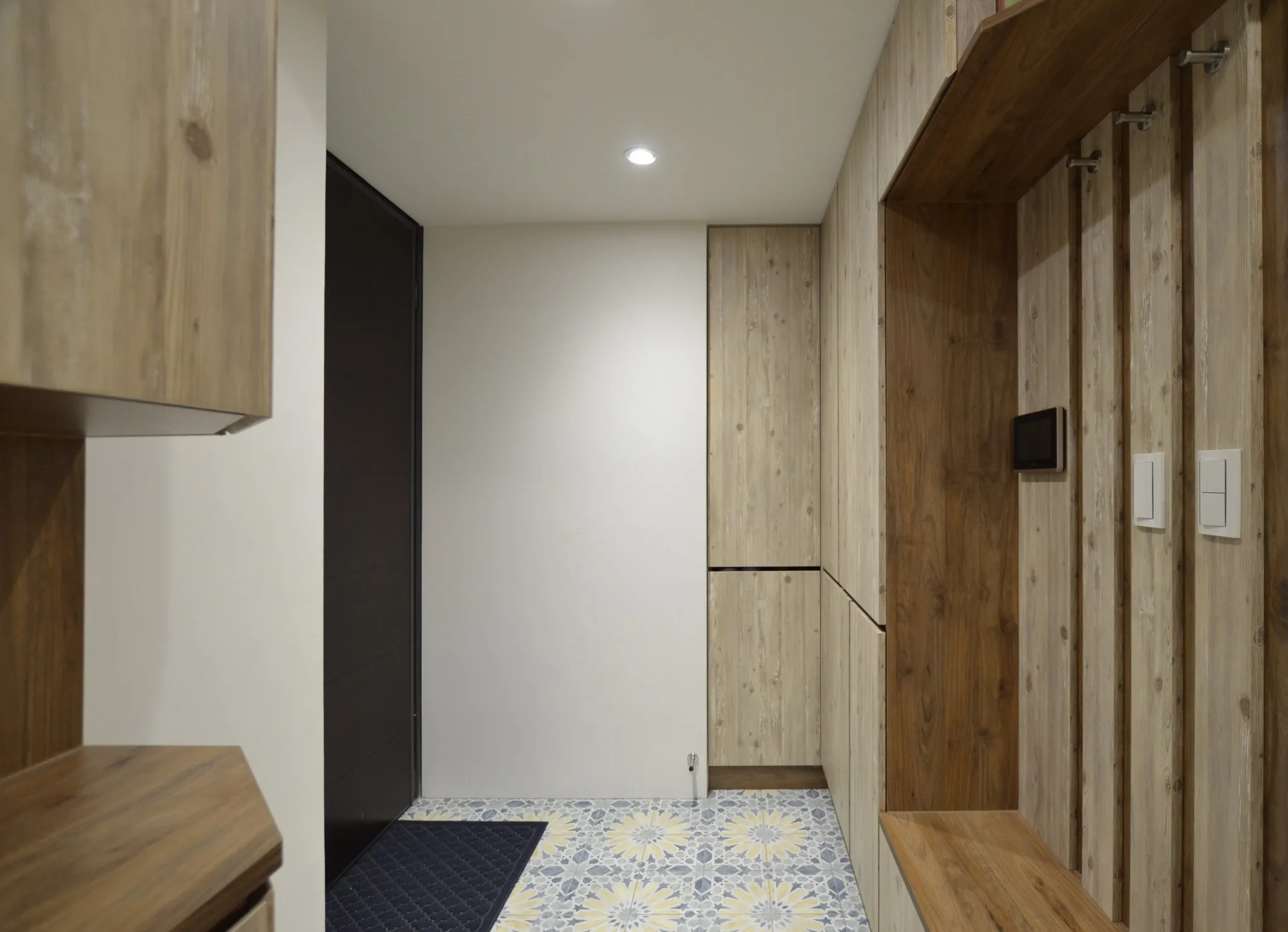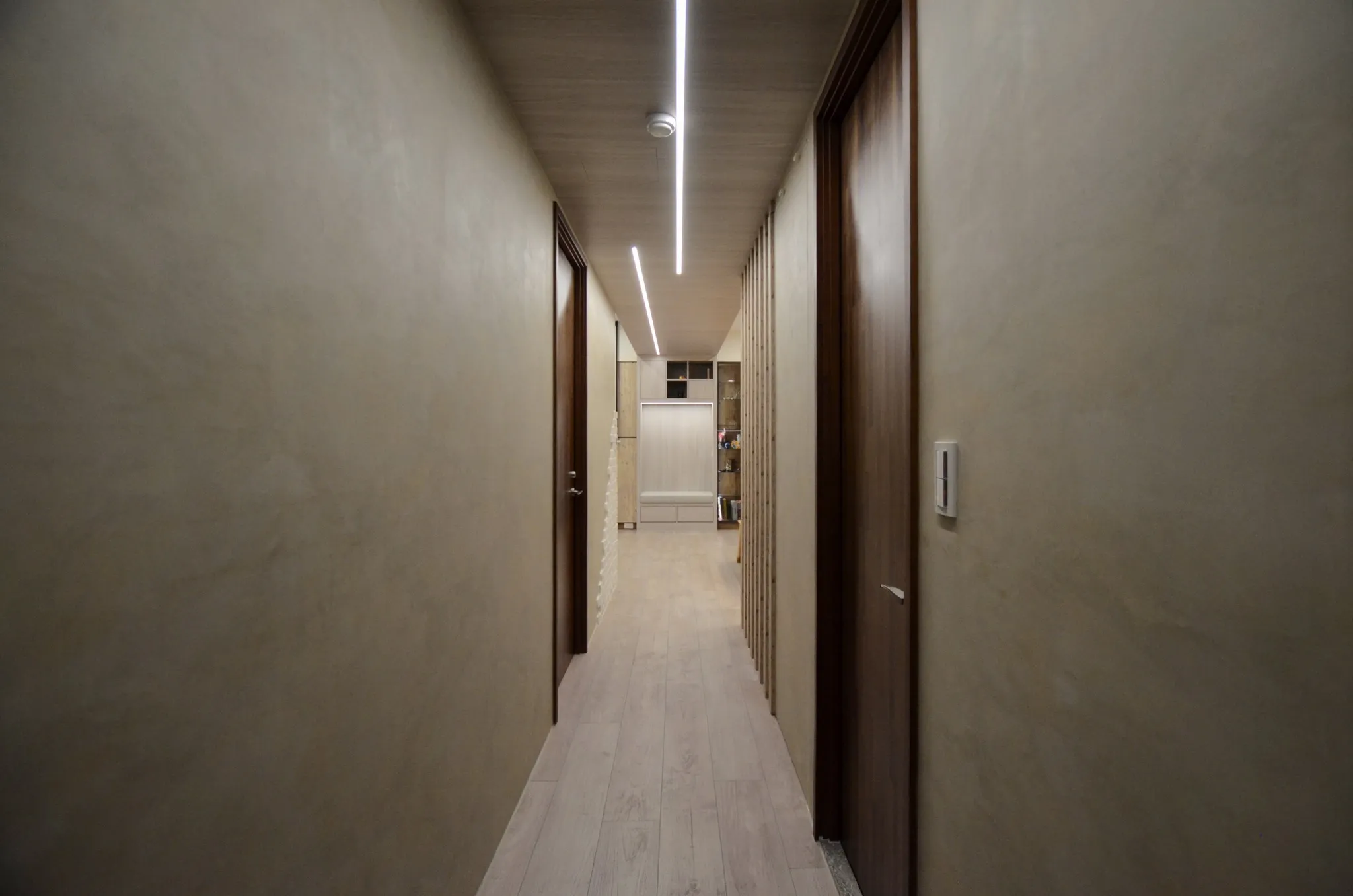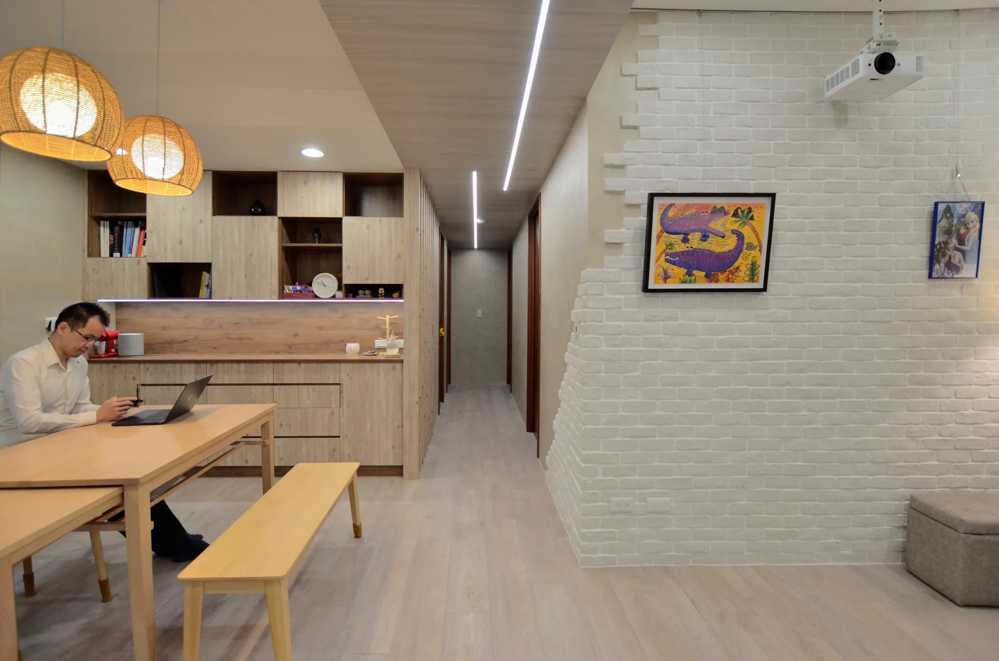 這是一個為四口之家量身打造的親子宅。 我們捨去傳統電視牆與沙發配置,改以投影機取代制式螢幕,讓客廳回歸最純粹的樣貌——一座能自由奔跑、玩耍、閱讀與成長的孩子活動空間。 無電視牆的設計,讓視覺更加留白,也讓空間使用更具彈性;白天是孩子的遊戲場,夜晚則化身為全家共享的投影劇院。整體以溫潤木質鋪陳,搭配柔和間接照明,營造安定、放鬆的居家氛圍,陪伴一家人的日常節奏。 收納機能整合於牆面之中,維持空間的清爽與秩序,讓生活自然發生。走廊牆面則選用斯曼特漆,細膩的手作質感在光影流動間展現層次,溫柔地串聯公共區域與私領域。 沒有沙發、沒有制式電視牆, 卻多了更多陪伴與互動。 這不只是一個完成的室內設計,而是一個以孩子為核心、為家庭成長預留彈性的生活場景。