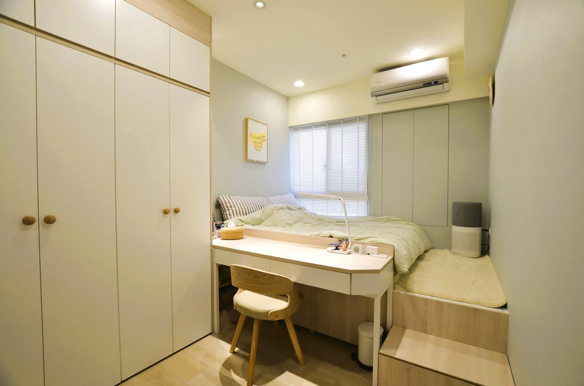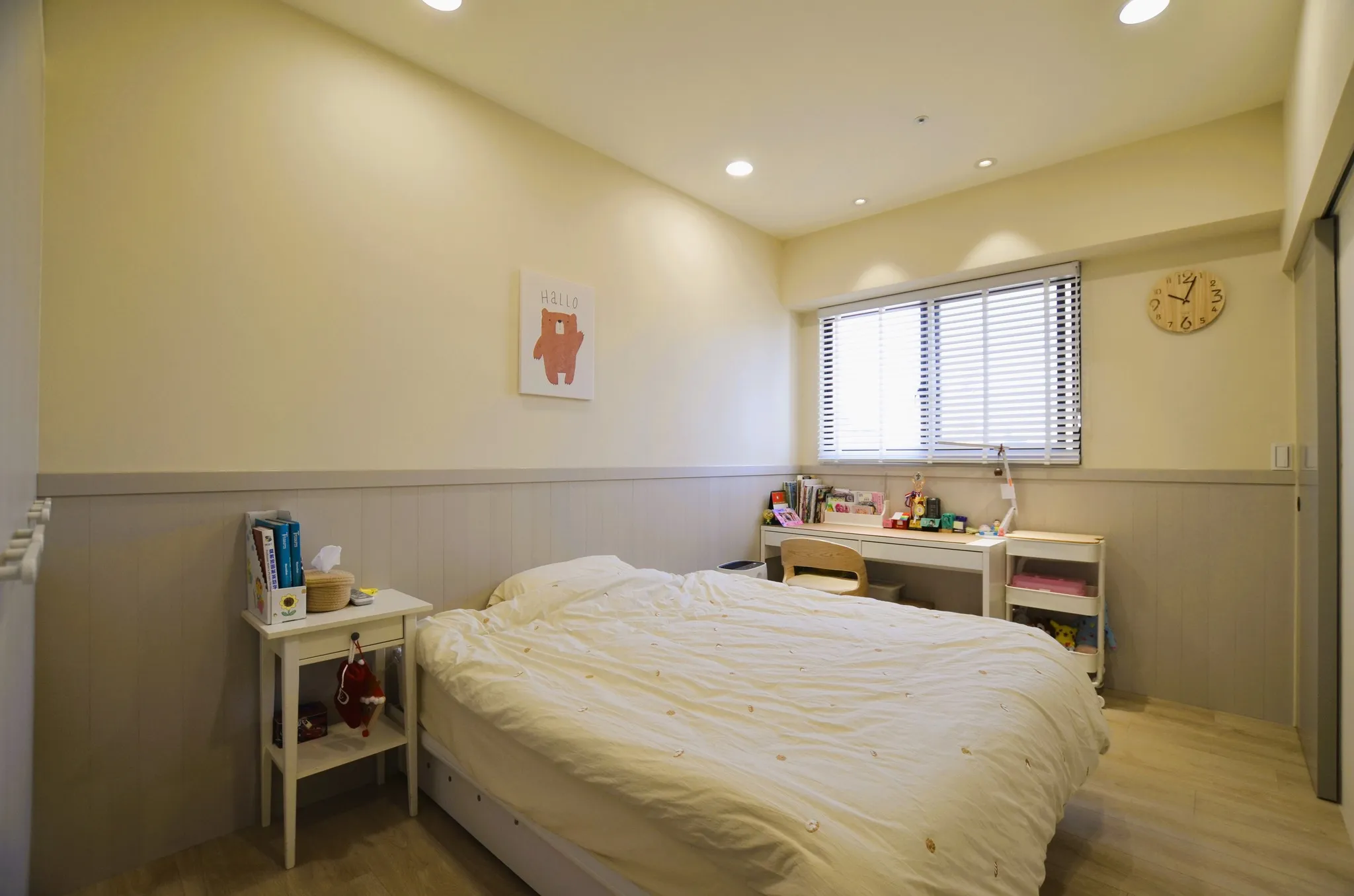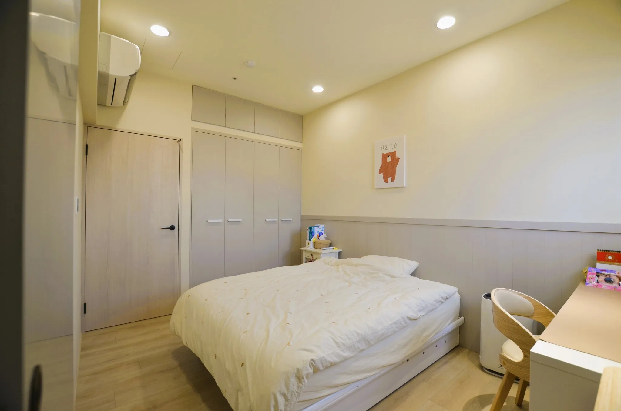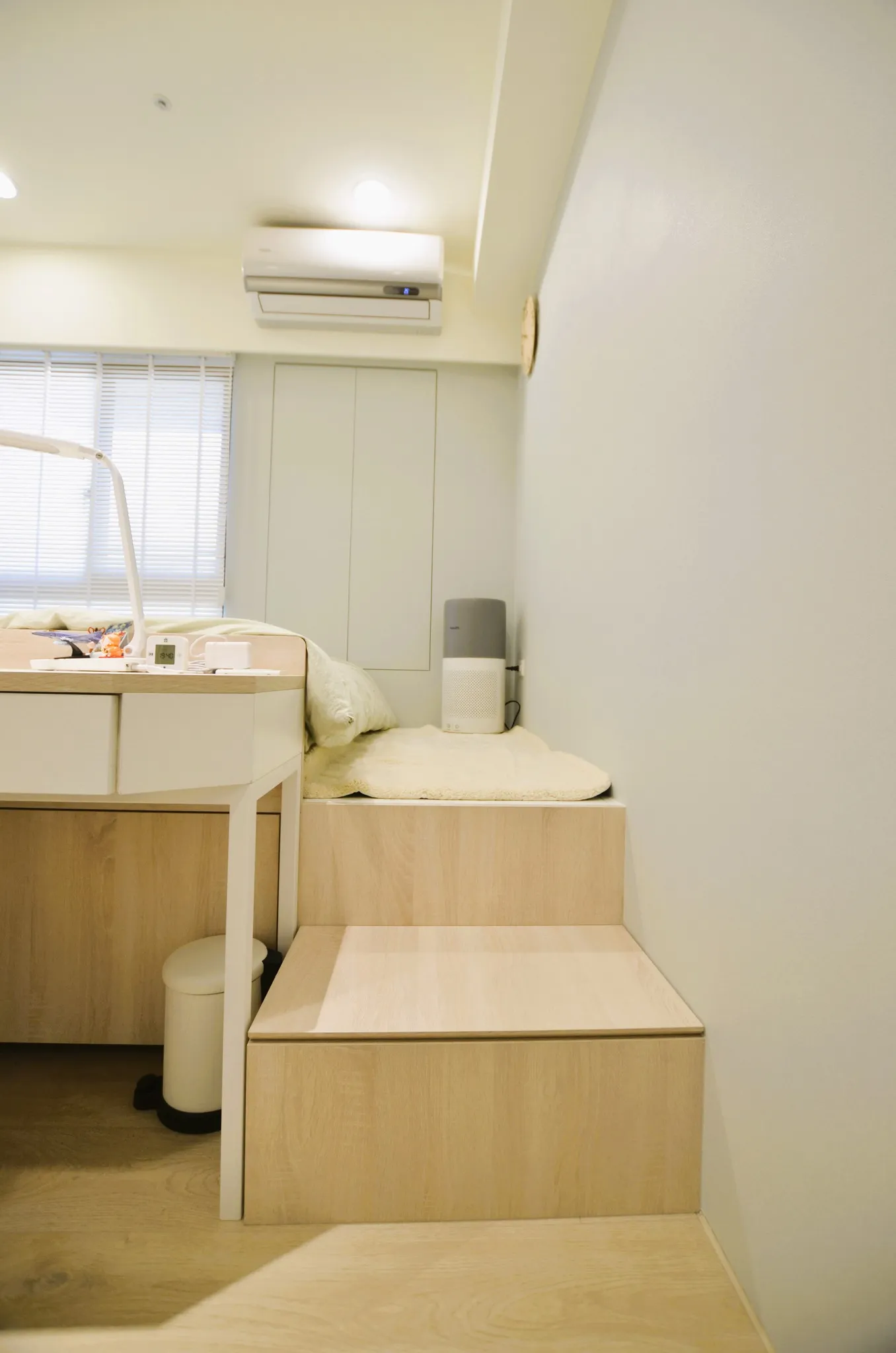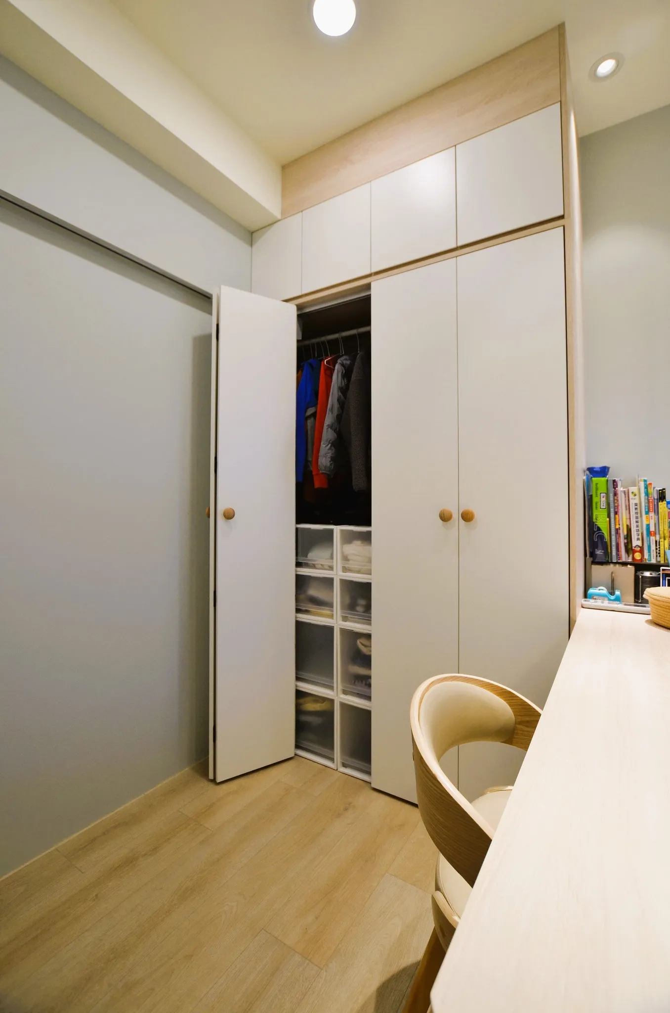 低彩度的奶油糖果色和木色, 加上業主挑選的壁布及家飾妝點, 不僅有造型還兼具大量收納的功能, 最適合一家四口的溫馨宅