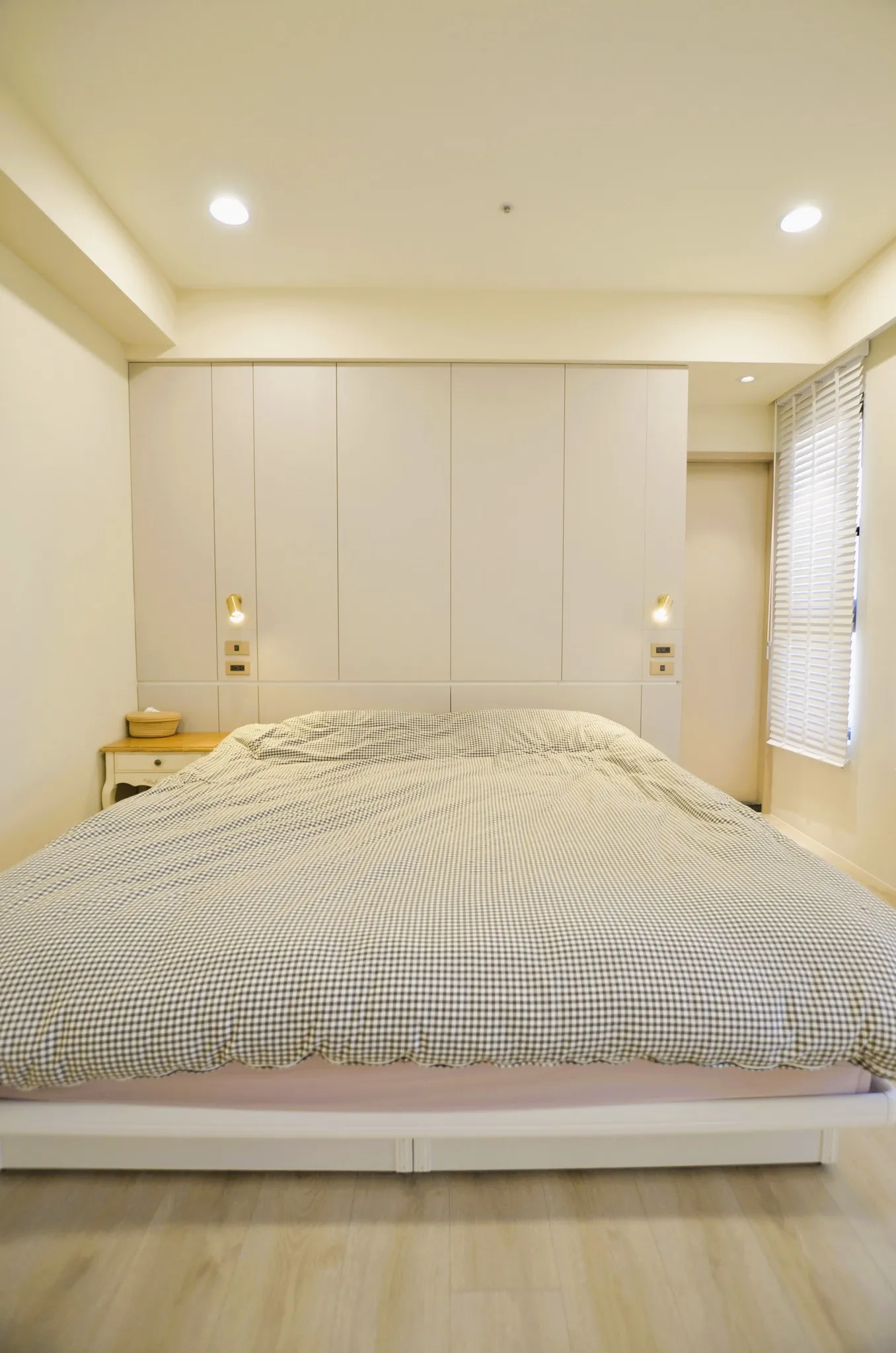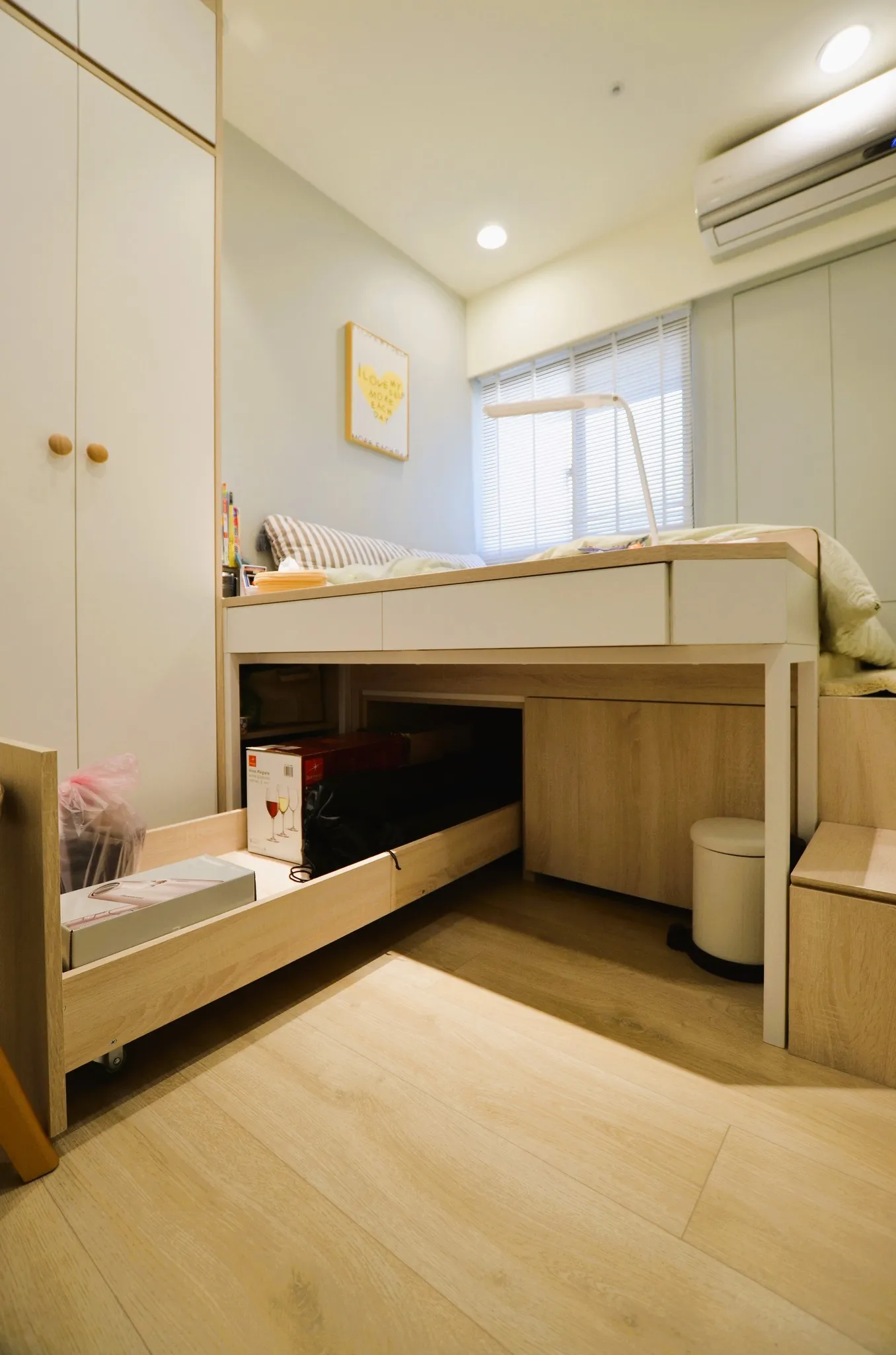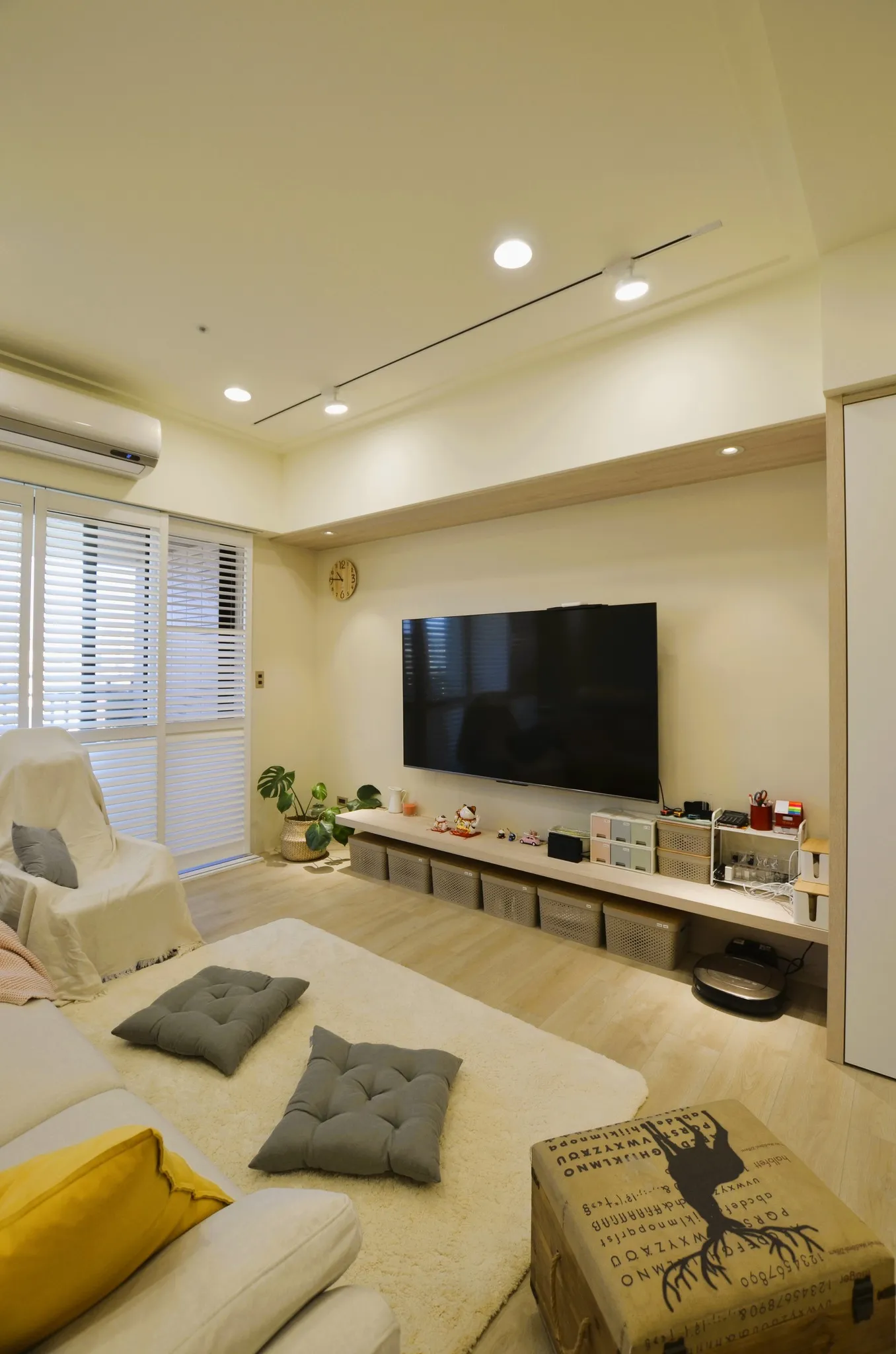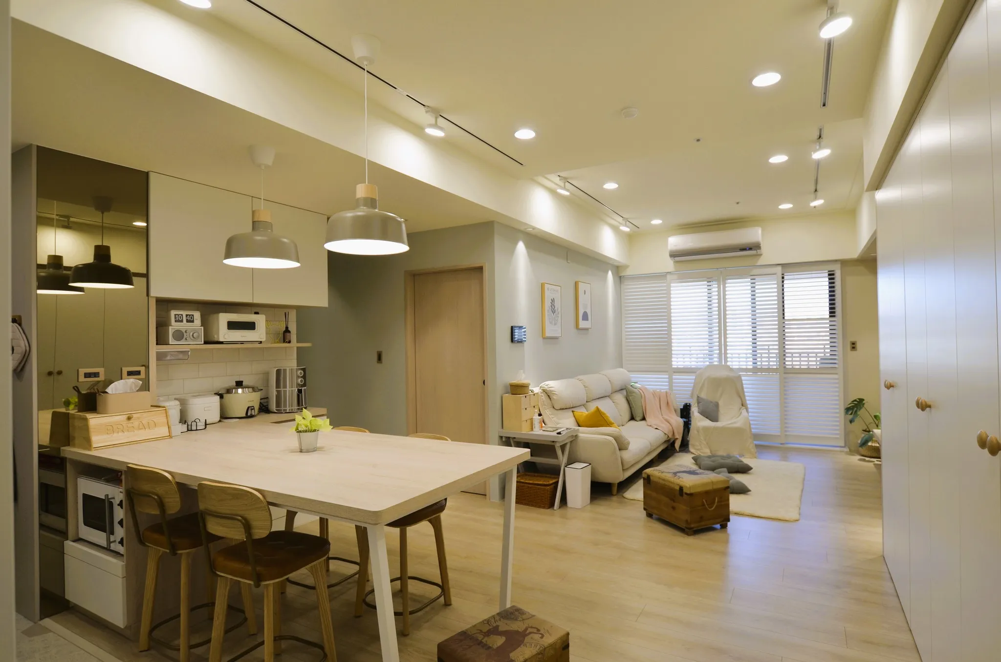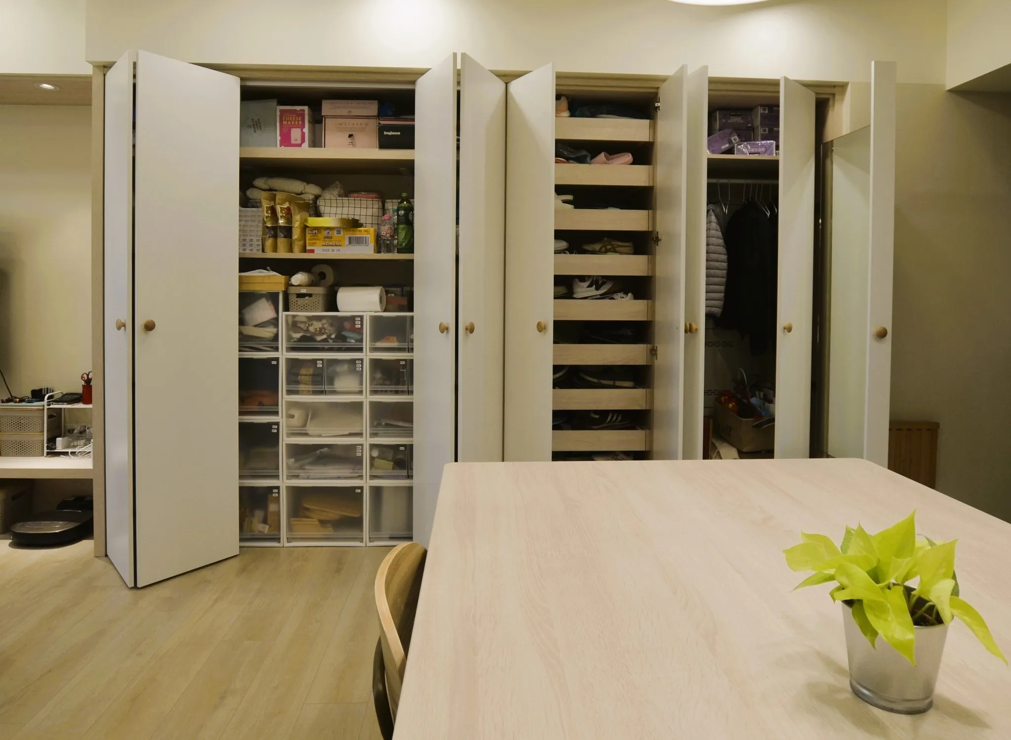 低彩度的奶油糖果色和木色, 加上業主挑選的壁布及家飾妝點, 不僅有造型還兼具大量收納的功能, 最適合一家四口的溫馨宅