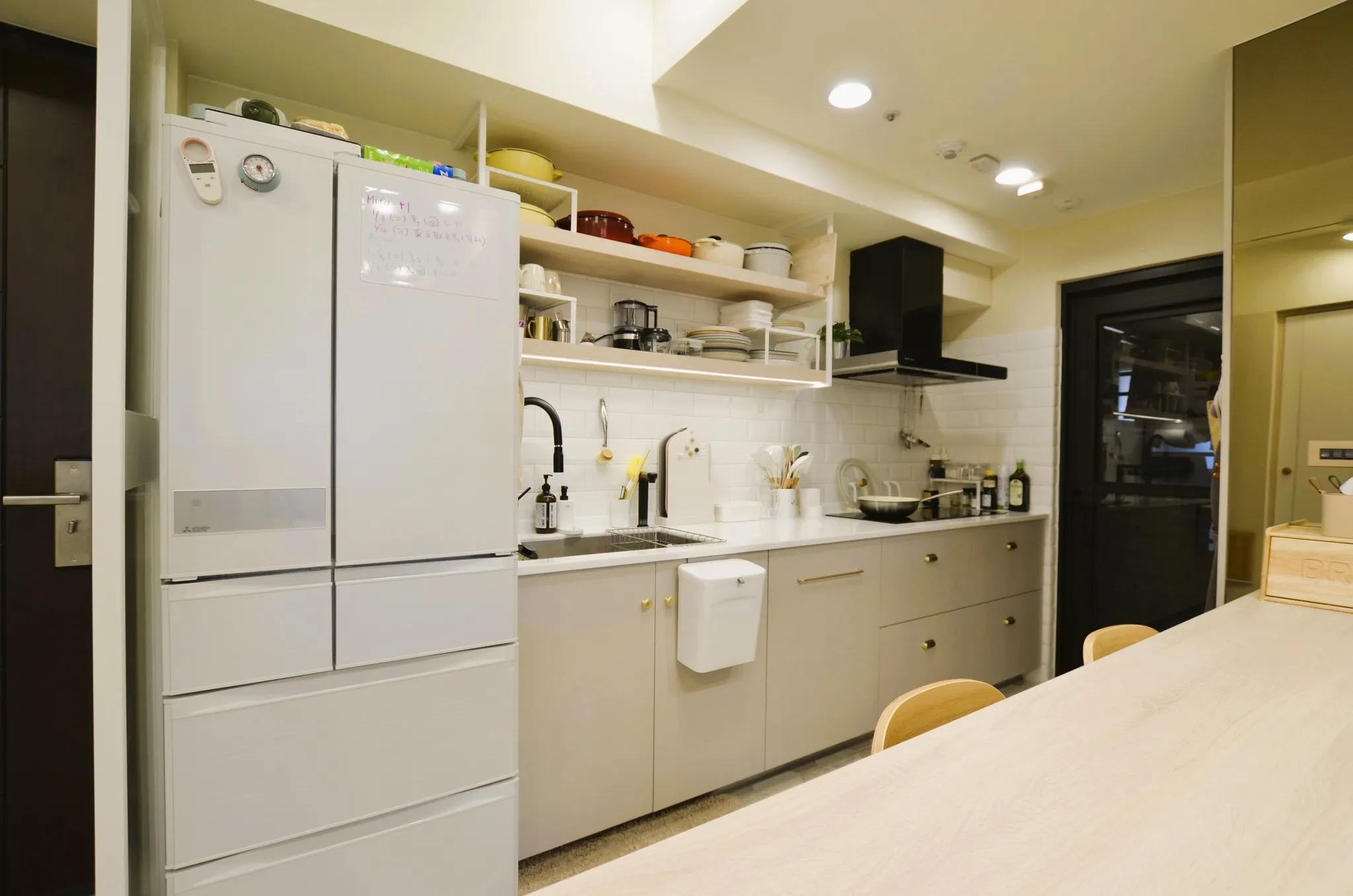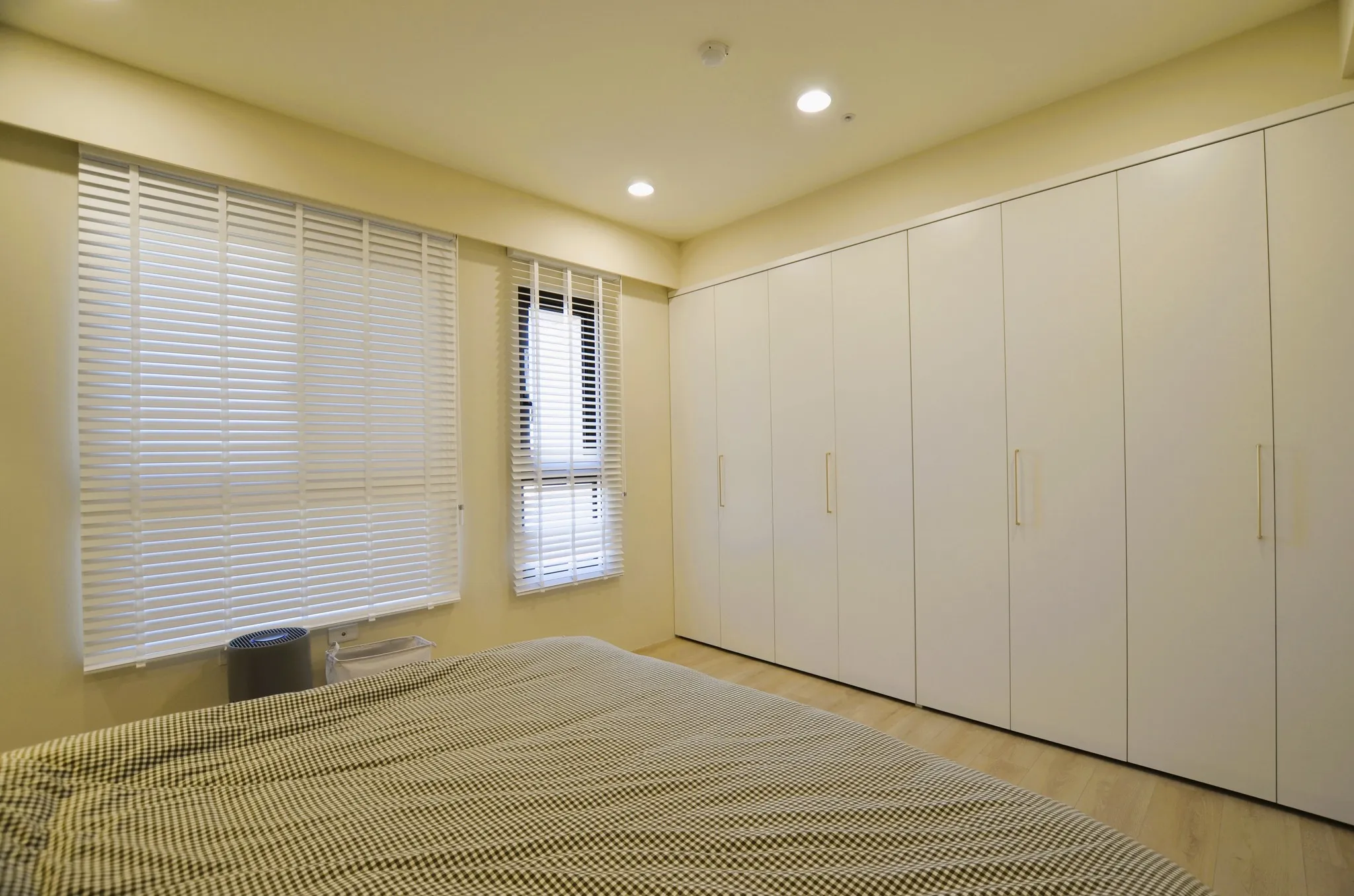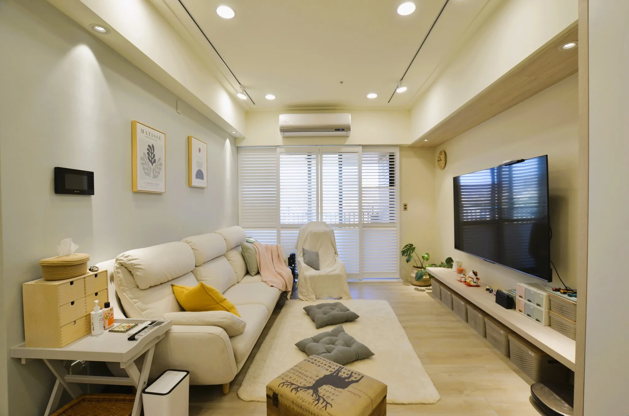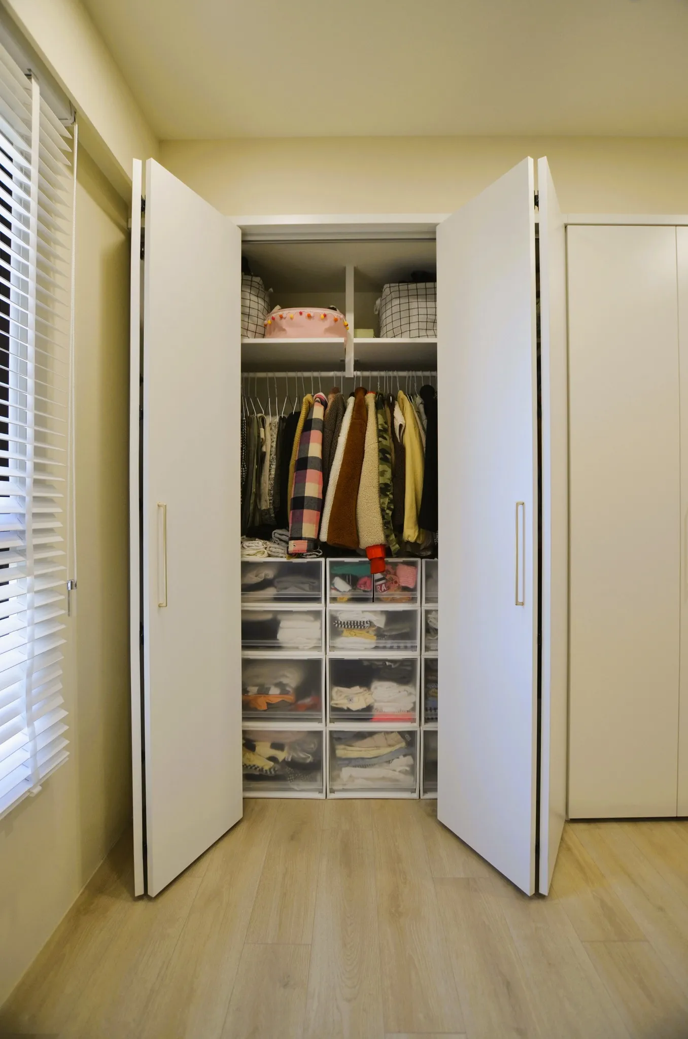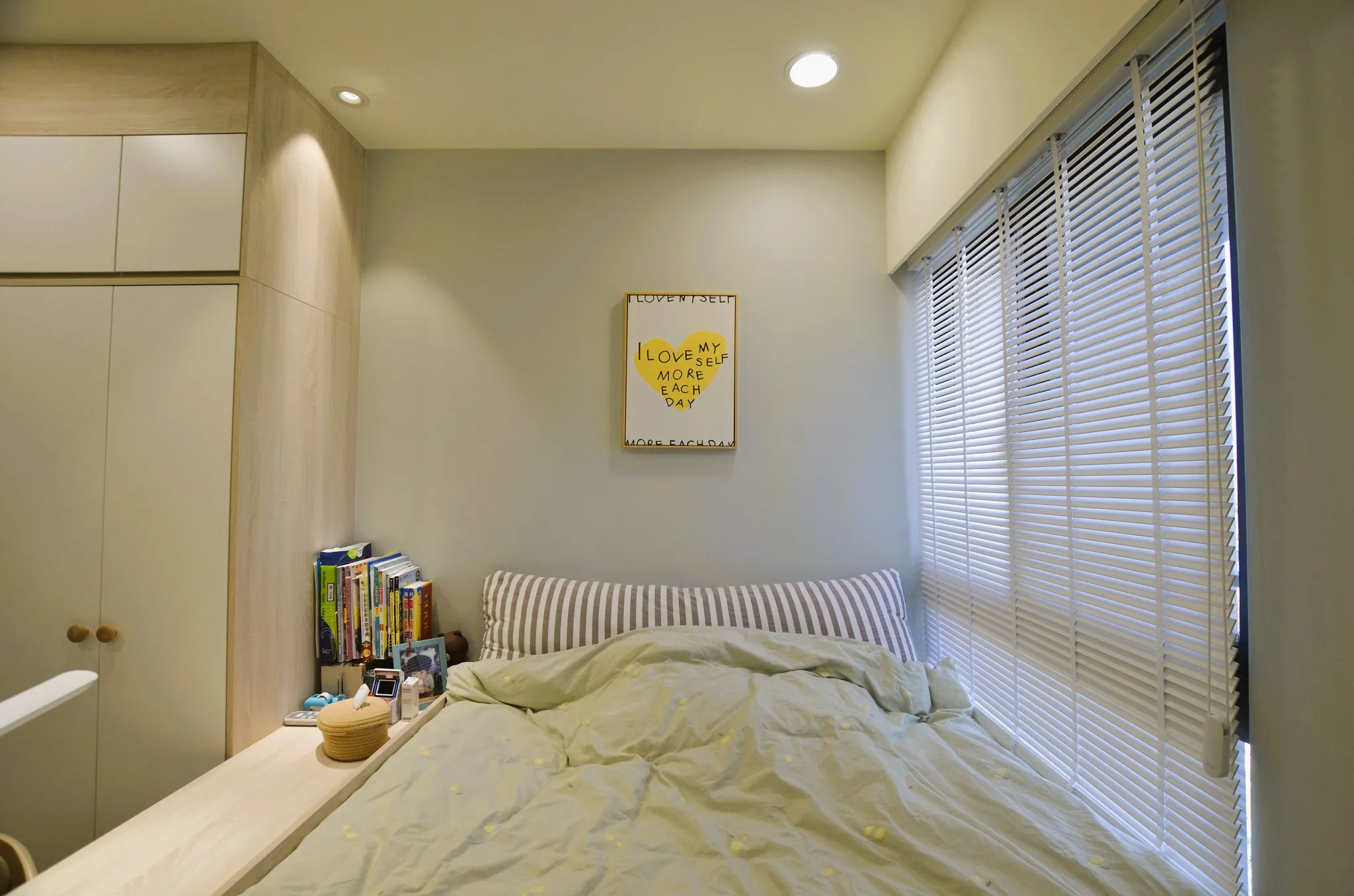 低彩度的奶油糖果色和木色, 加上業主挑選的壁布及家飾妝點, 不僅有造型還兼具大量收納的功能, 最適合一家四口的溫馨宅