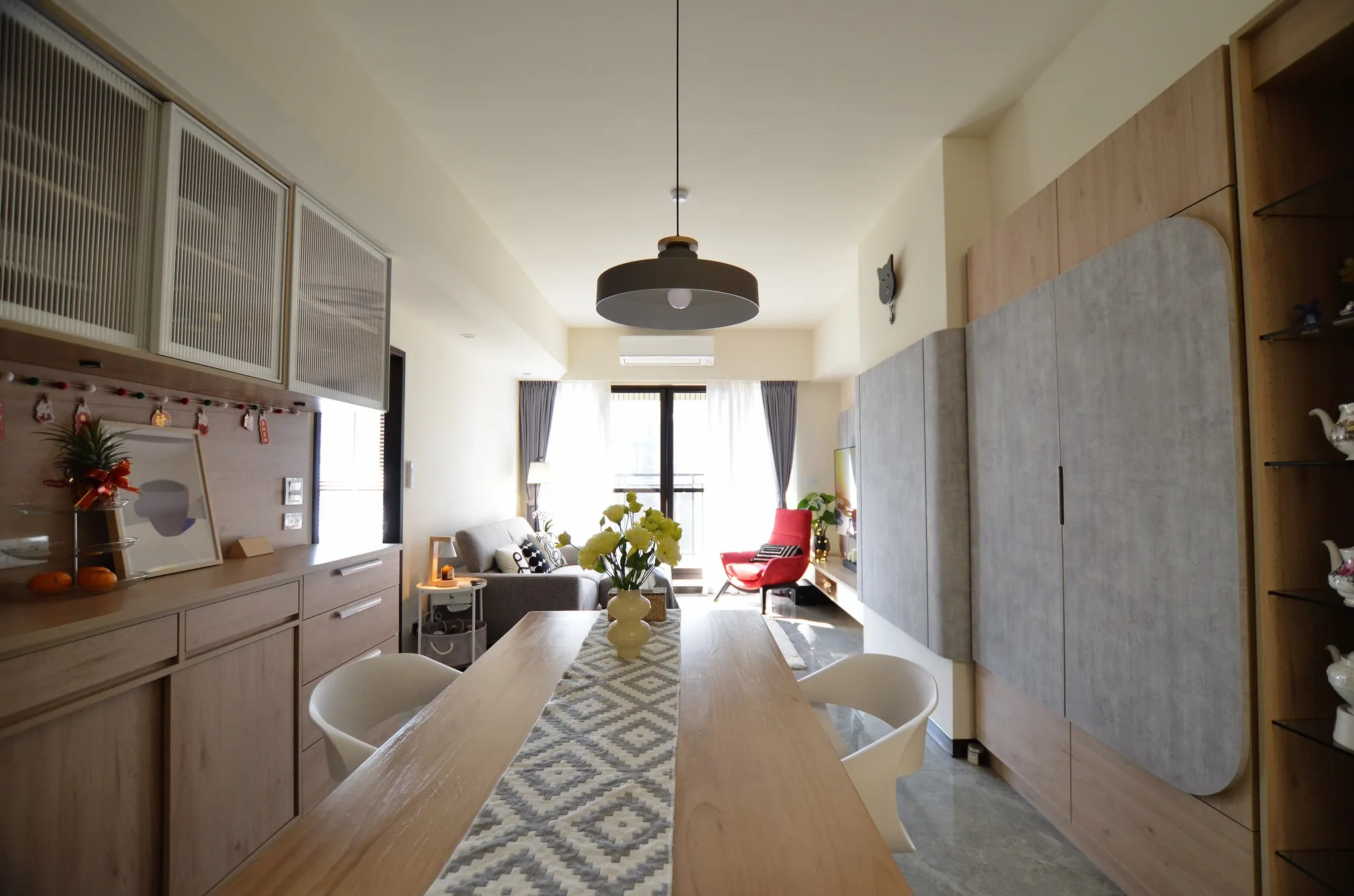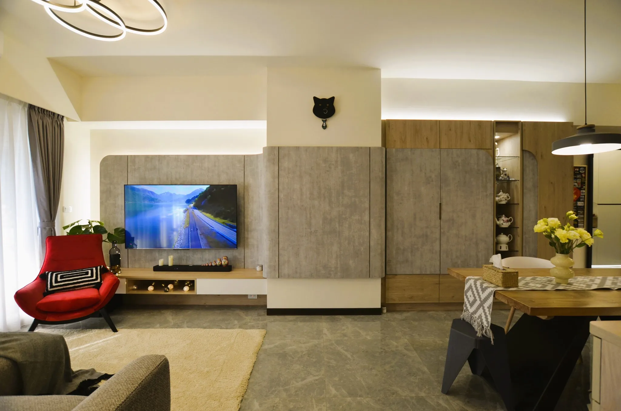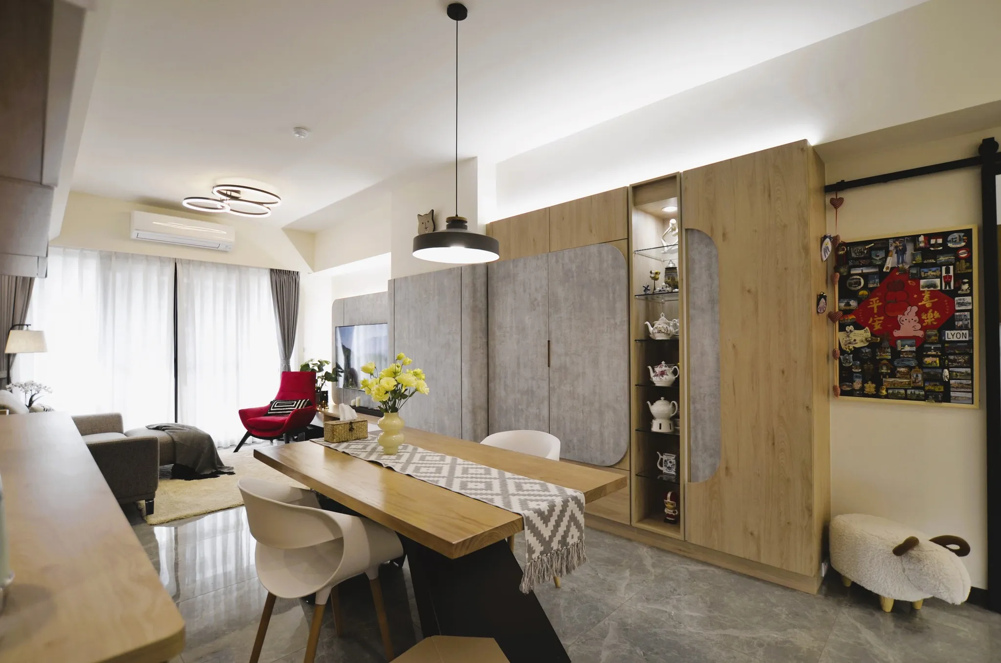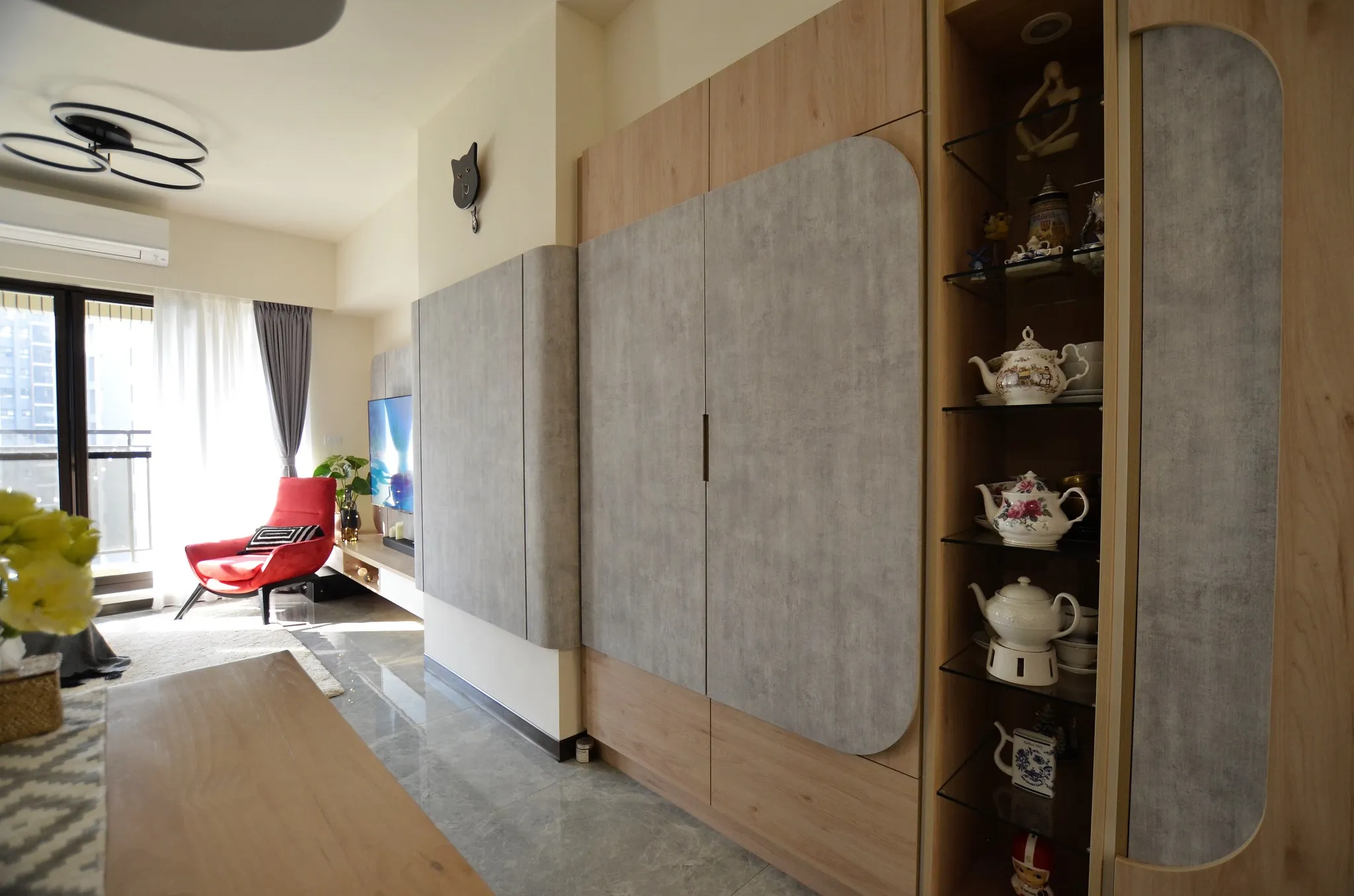 這場案子利用木作美耐板可彎曲的特性,從電視牆延伸到收納展示櫃,降低了中間柱子的突兀感。 顏色挑選與原有地板呼應的灰色調,櫃體以純白配上溫暖的木頭紋,擺放上業主從國外帶回來的各種紀念品,讓整間屋子充滿很多回憶的溫馨感。