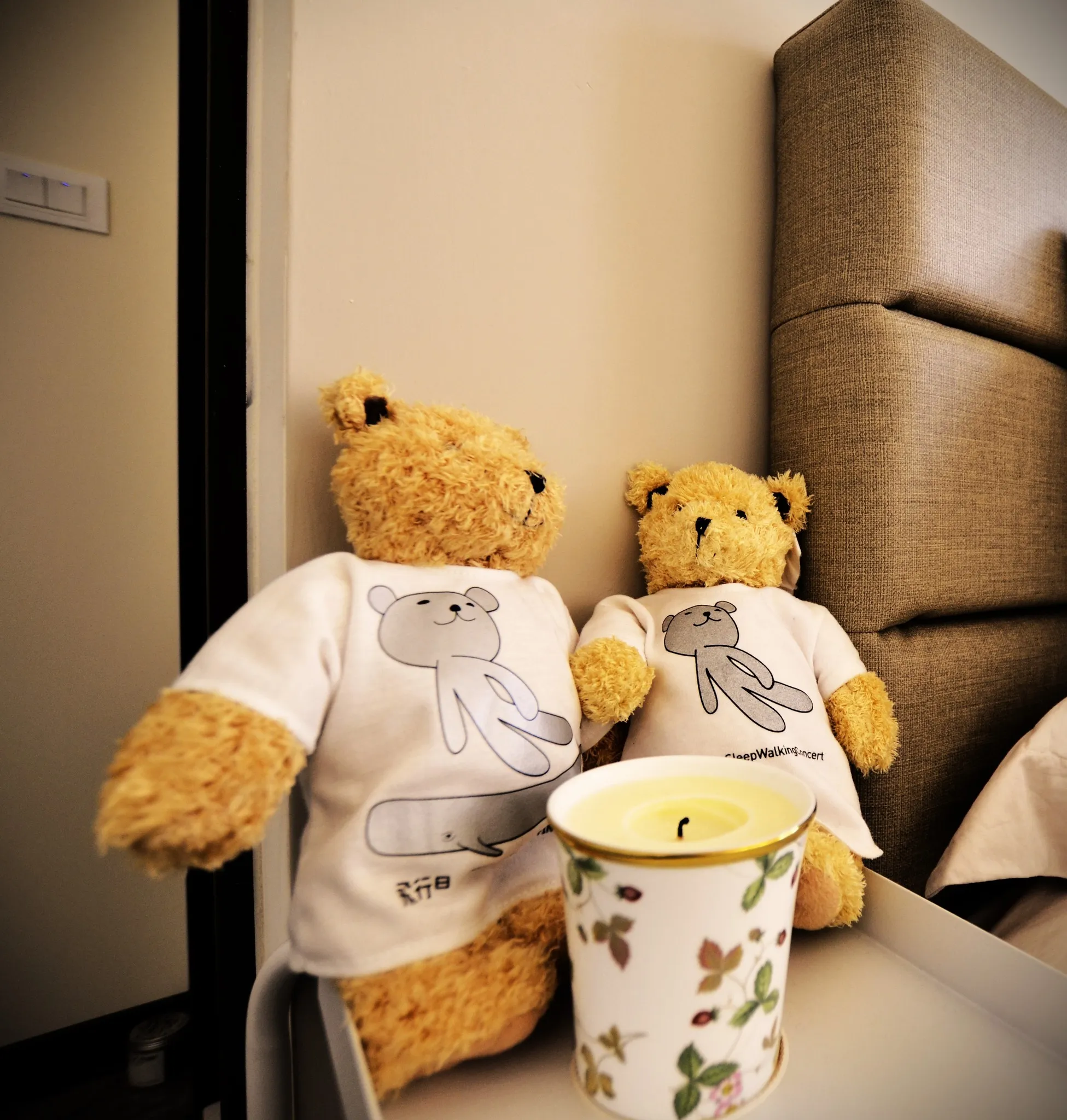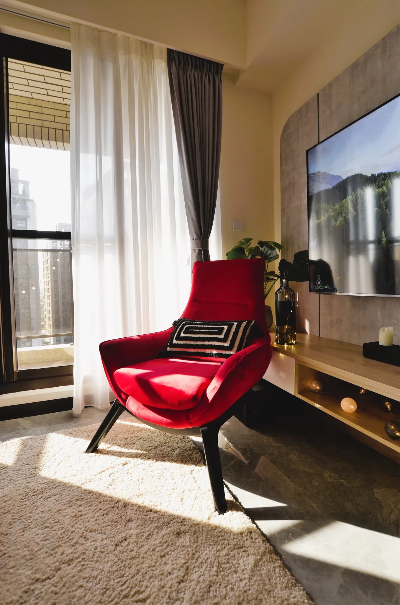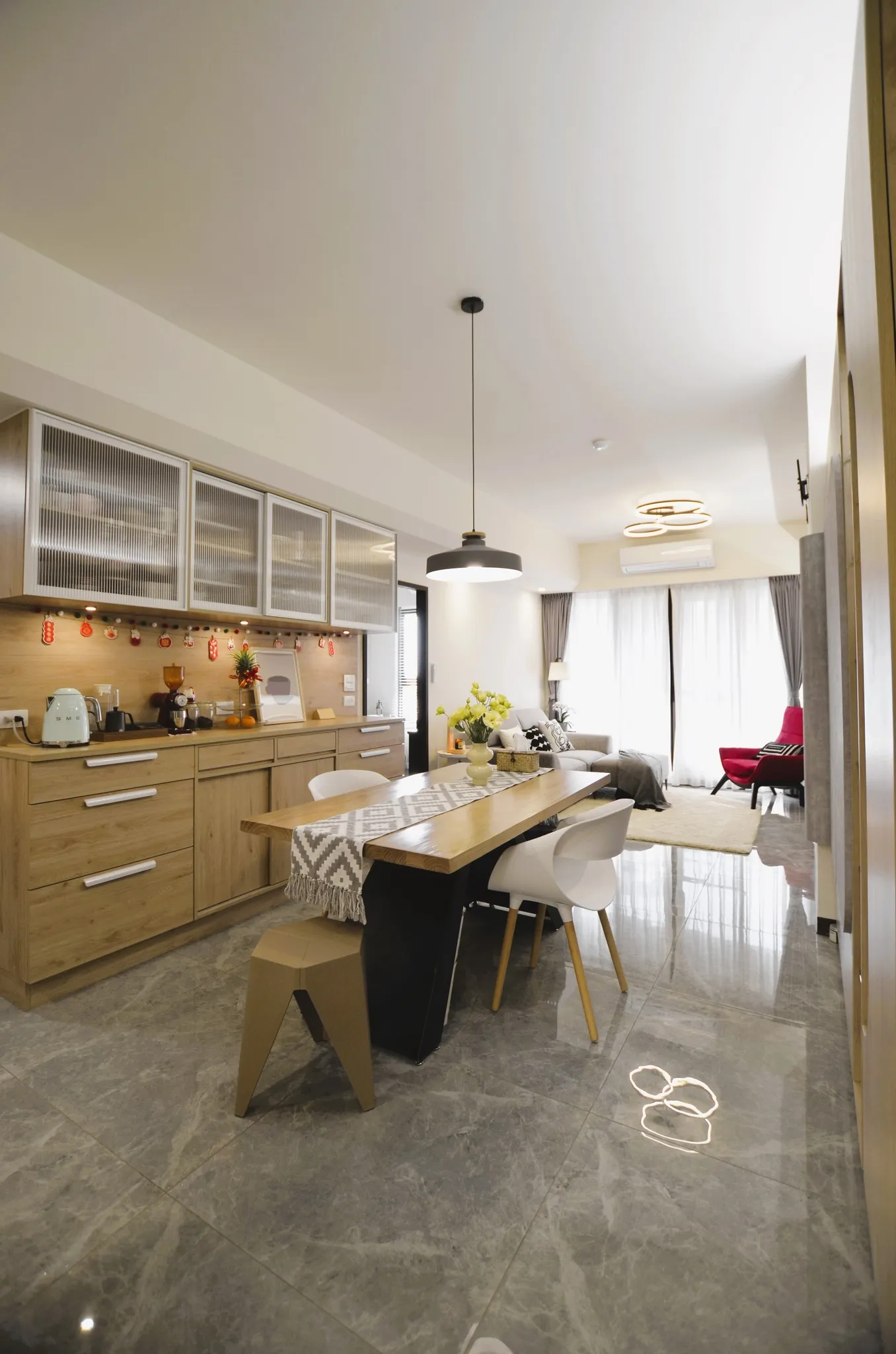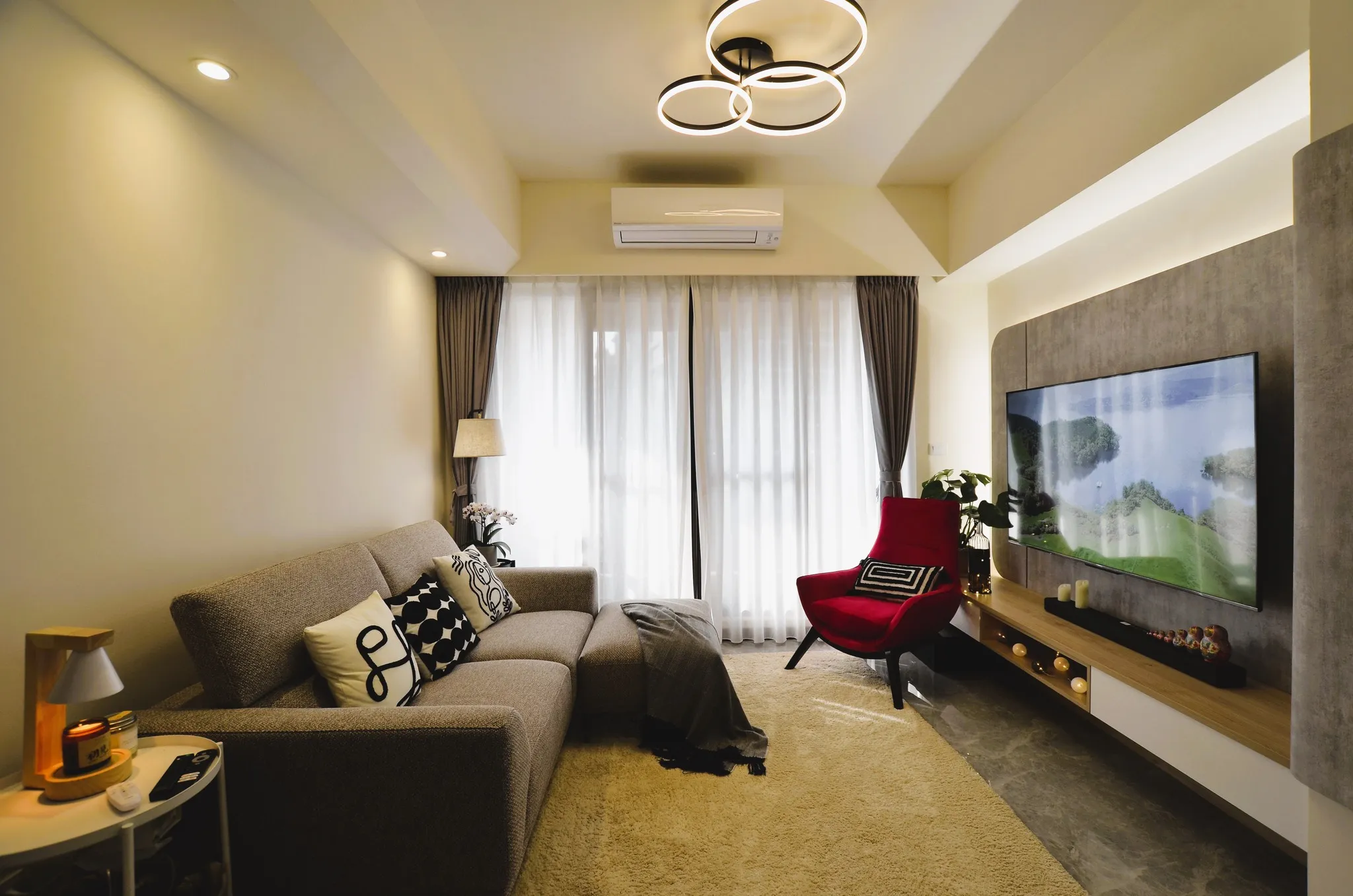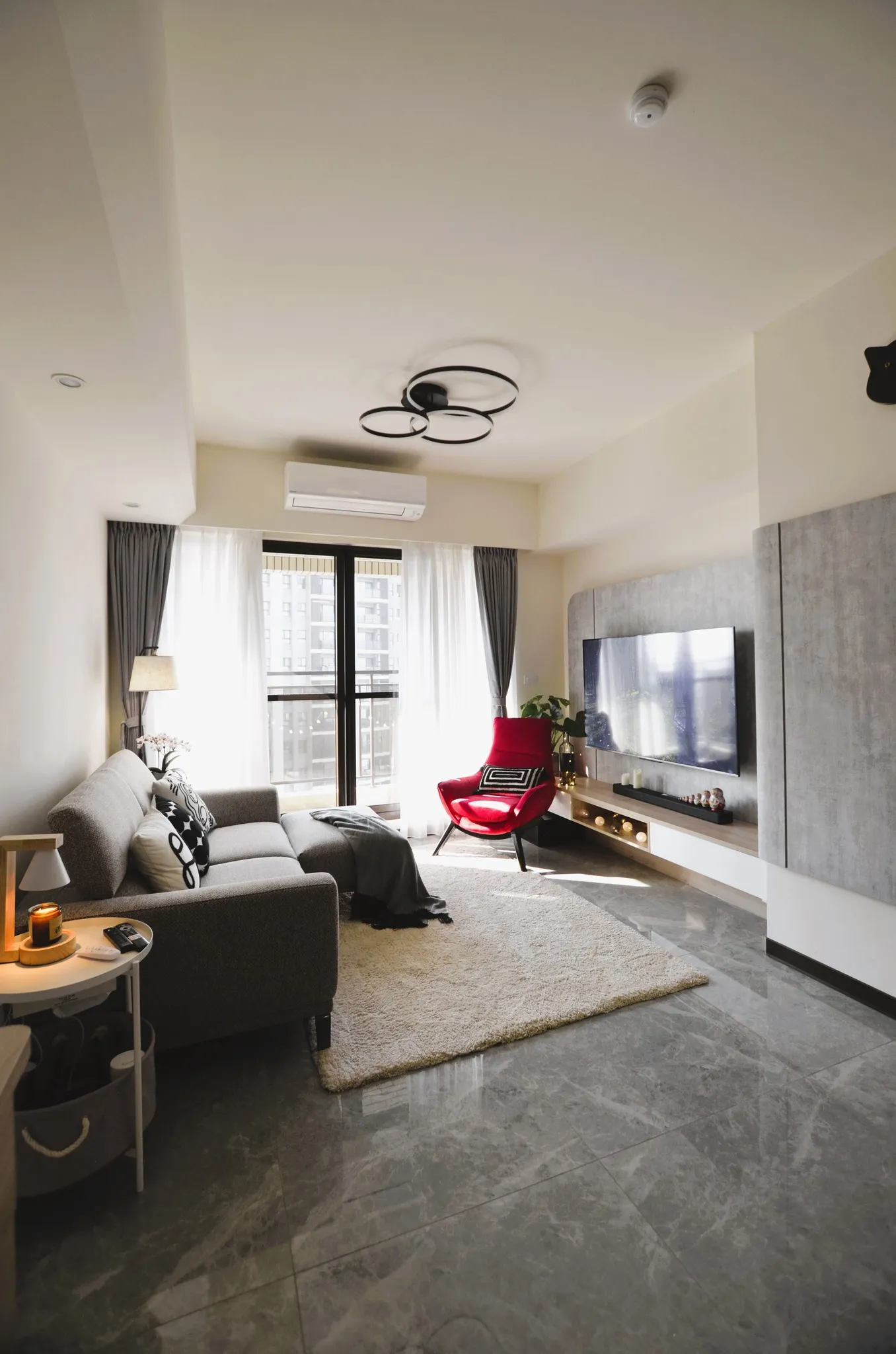 這場案子利用木作美耐板可彎曲的特性,從電視牆延伸到收納展示櫃,降低了中間柱子的突兀感。 顏色挑選與原有地板呼應的灰色調,櫃體以純白配上溫暖的木頭紋,擺放上業主從國外帶回來的各種紀念品,讓整間屋子充滿很多回憶的溫馨感。