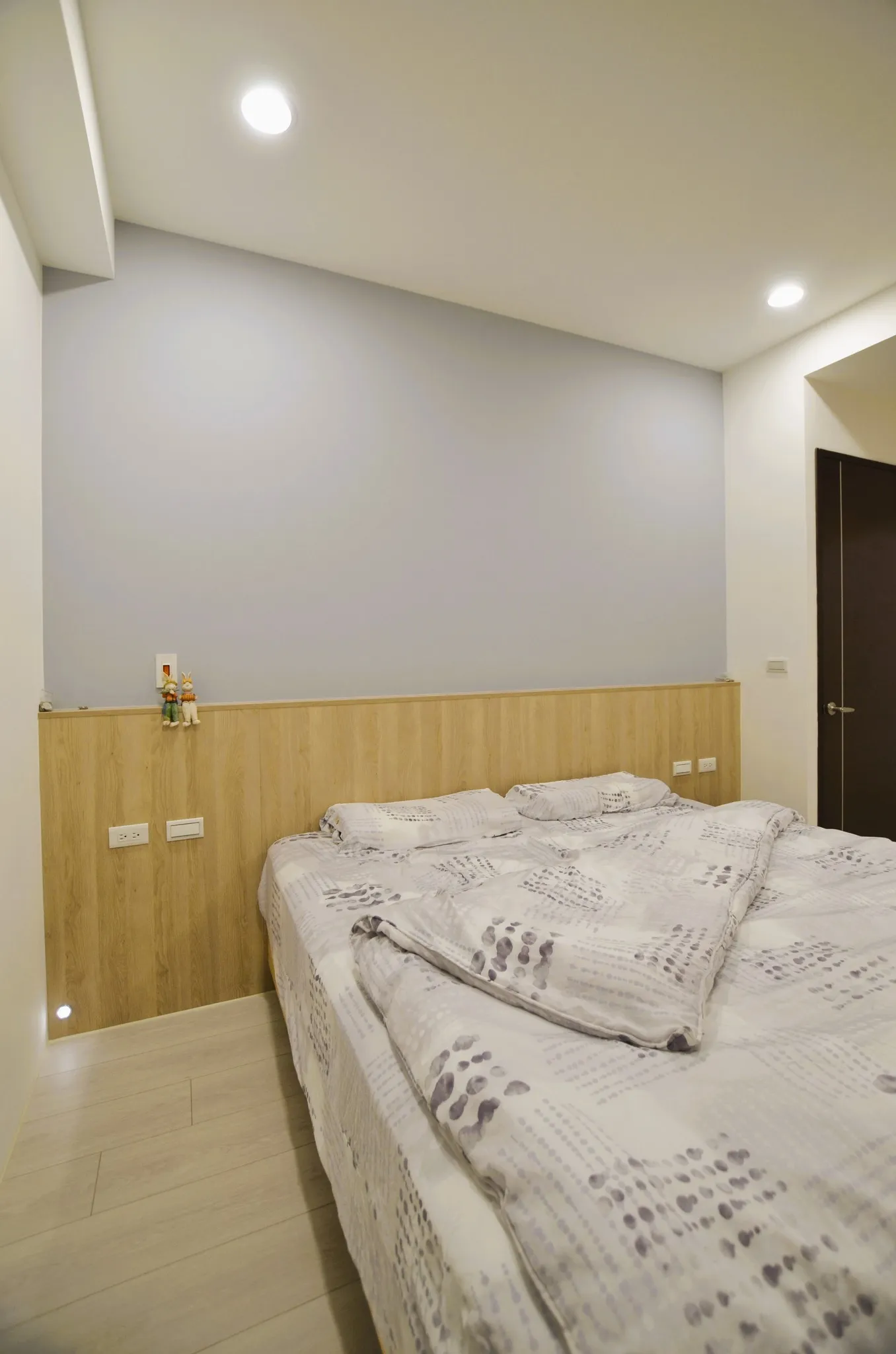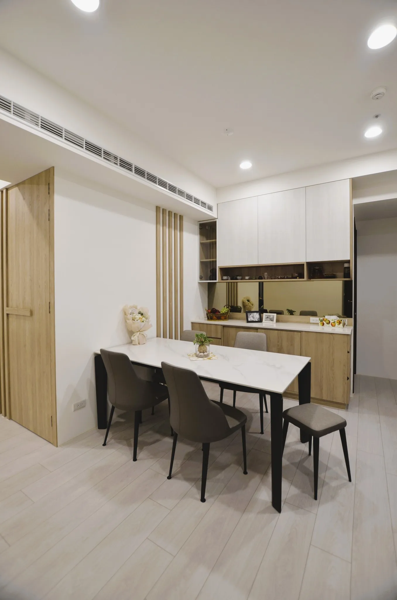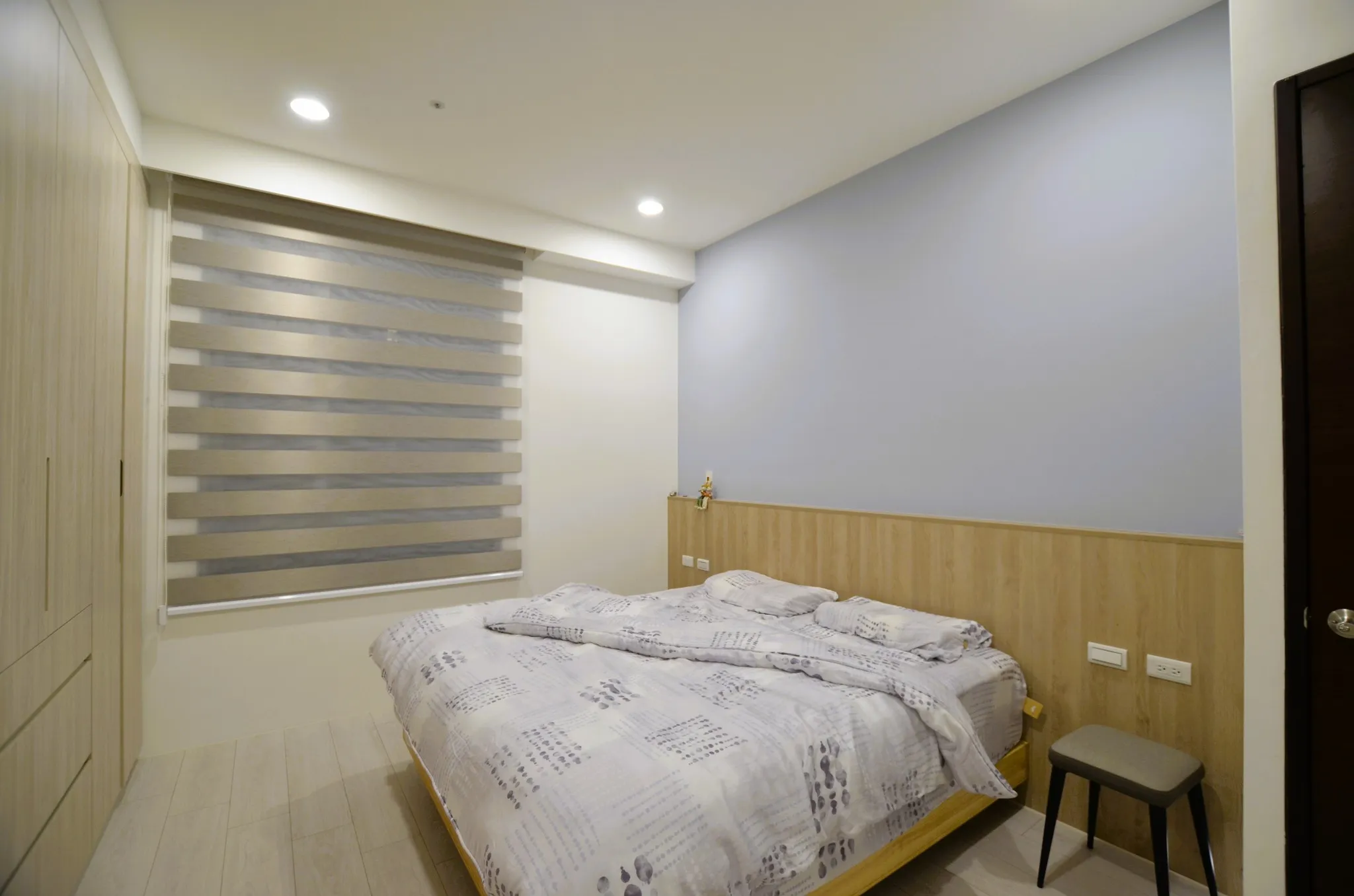 這次的裝修風格主要以簡約為主,並以溫暖的米色和灰色加木紋為色調。客廳的電視牆做了留白的設計,搭配上簡約的沙發和茶几,整體看起來非常舒適。餐廳的空間不大,所以選擇了長形的餐桌,且可隨人數增減轉向,也能讓家人們坐在一起吃飯更加方便。主臥室床頭做了背景牆跳色的設計,搭配上舒適的床品,讓整個空間顯得非常溫馨。