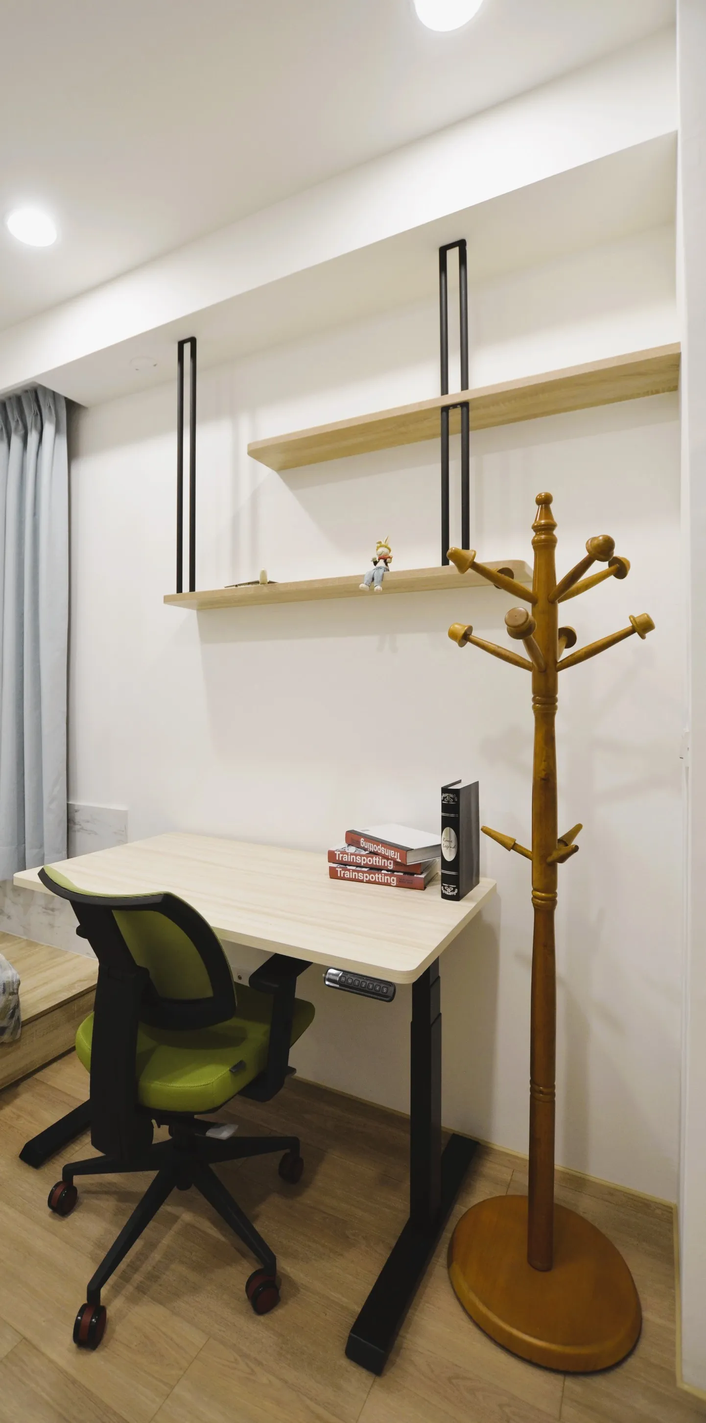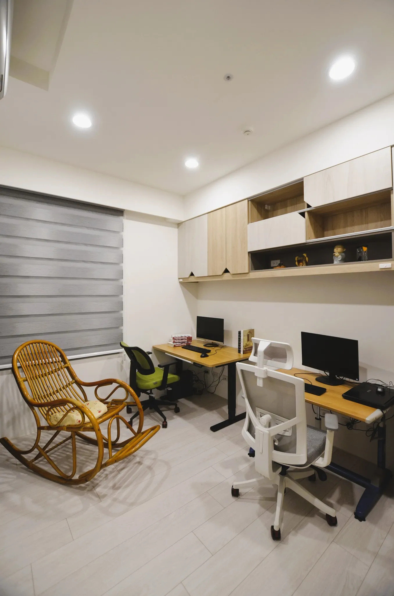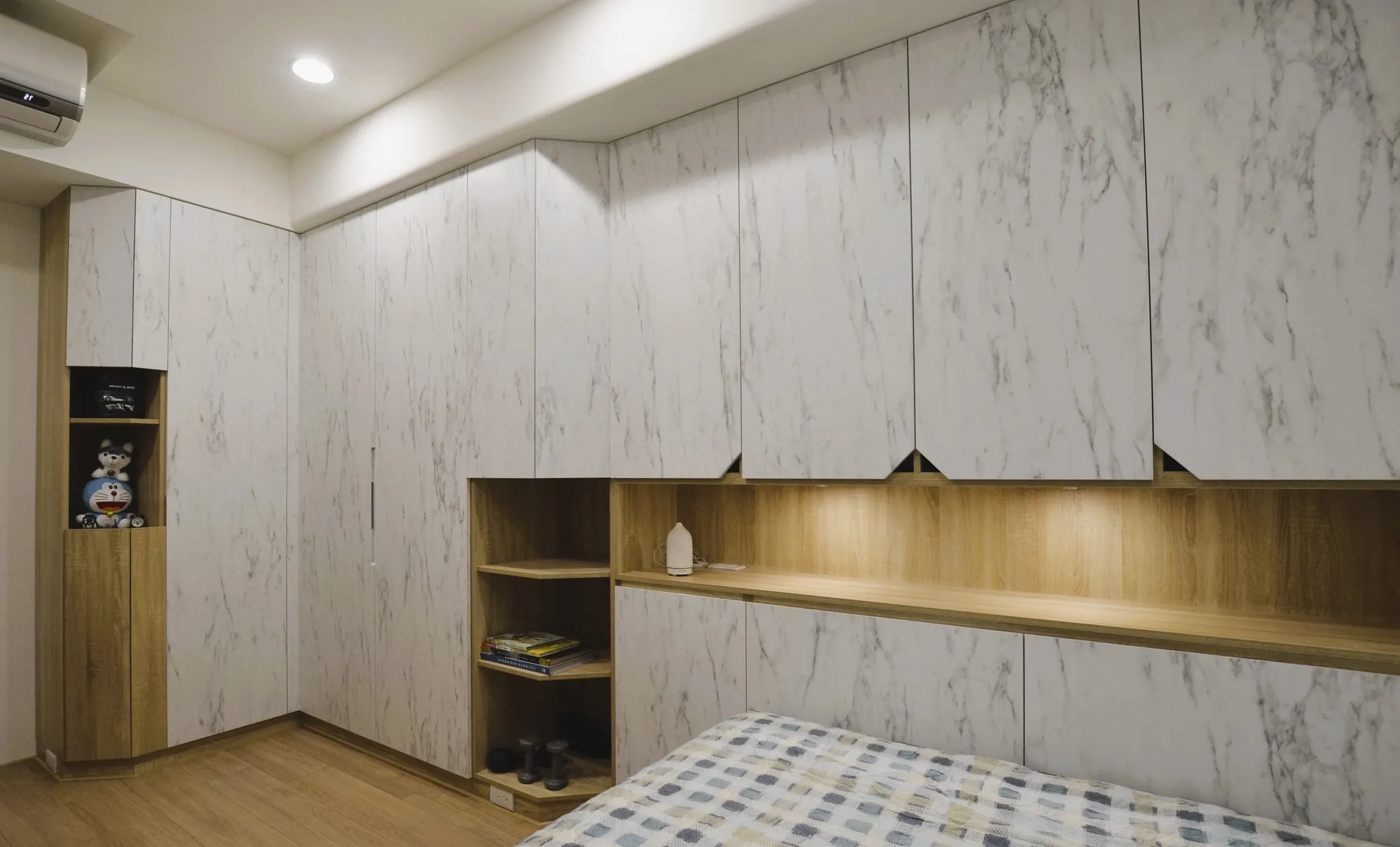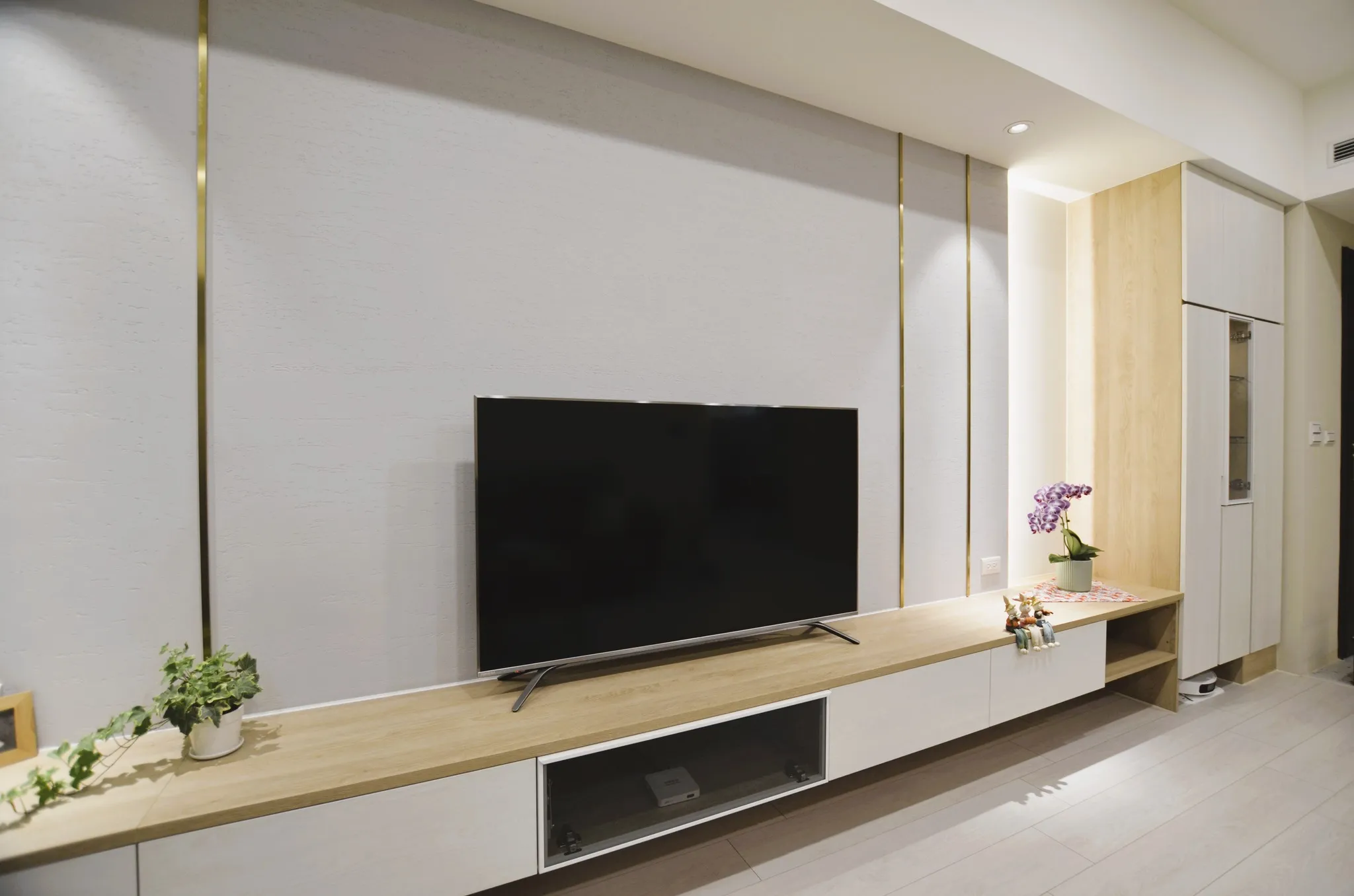這次的裝修風格主要以簡約為主,並以溫暖的米色和灰色加木紋為色調。客廳的電視牆做了留白的設計,搭配上簡約的沙發和茶几,整體看起來非常舒適。餐廳的空間不大,所以選擇了長形的餐桌,且可隨人數增減轉向,也能讓家人們坐在一起吃飯更加方便。主臥室床頭做了背景牆跳色的設計,搭配上舒適的床品,讓整個空間顯得非常溫馨。